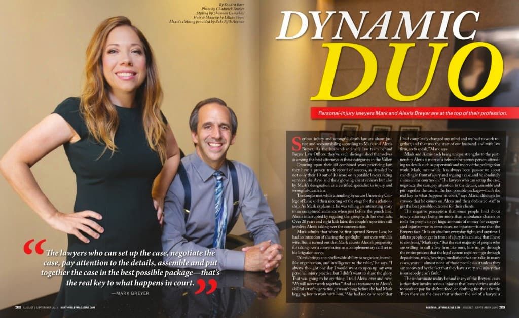 Mark and Alexis Breyer of Breyer Law Offices, P.C. were recently featured in North Valley Magazine, a bi-monthly lifestyle magazine that covers the Phoenix metropolitan area. Alexis and Mark were featured in the magazine for being recognized as two of the top attorneys in Arizona for injury and wrongful death law. The Husband and Wife Law Team has been practicing personal injury and wrongful death law together, giving them over 40 combined years of legal experience.